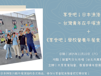 大享食育協會長期推動臺日韓跨國食農教育交流,活動邀請作者群分享在學校午餐廚房裡每天為孩子們努力的故事,帶領大家一窺營養午餐與食育現場的真實風景。